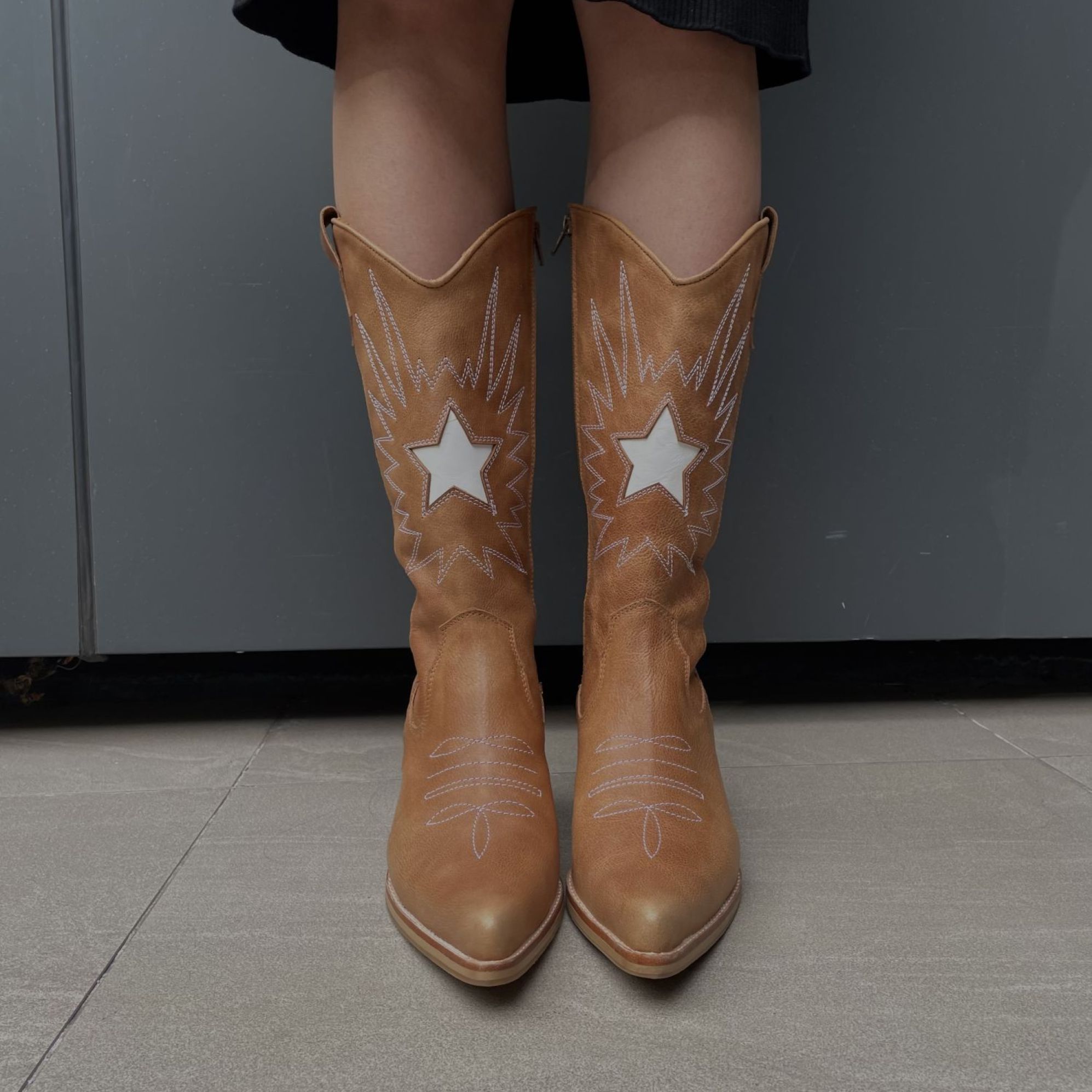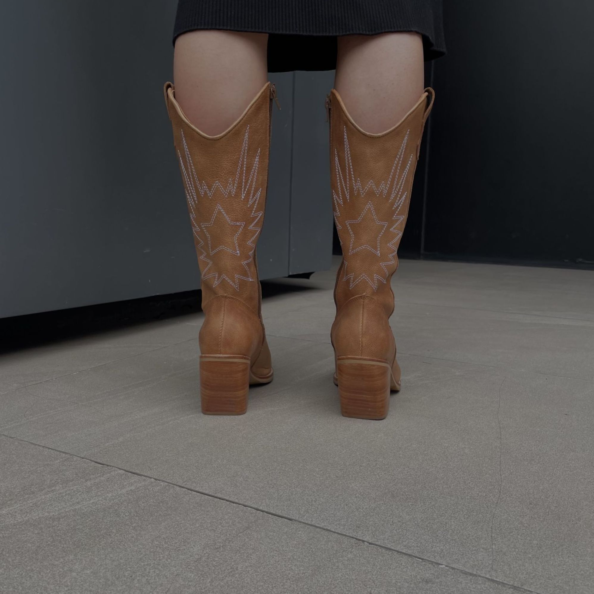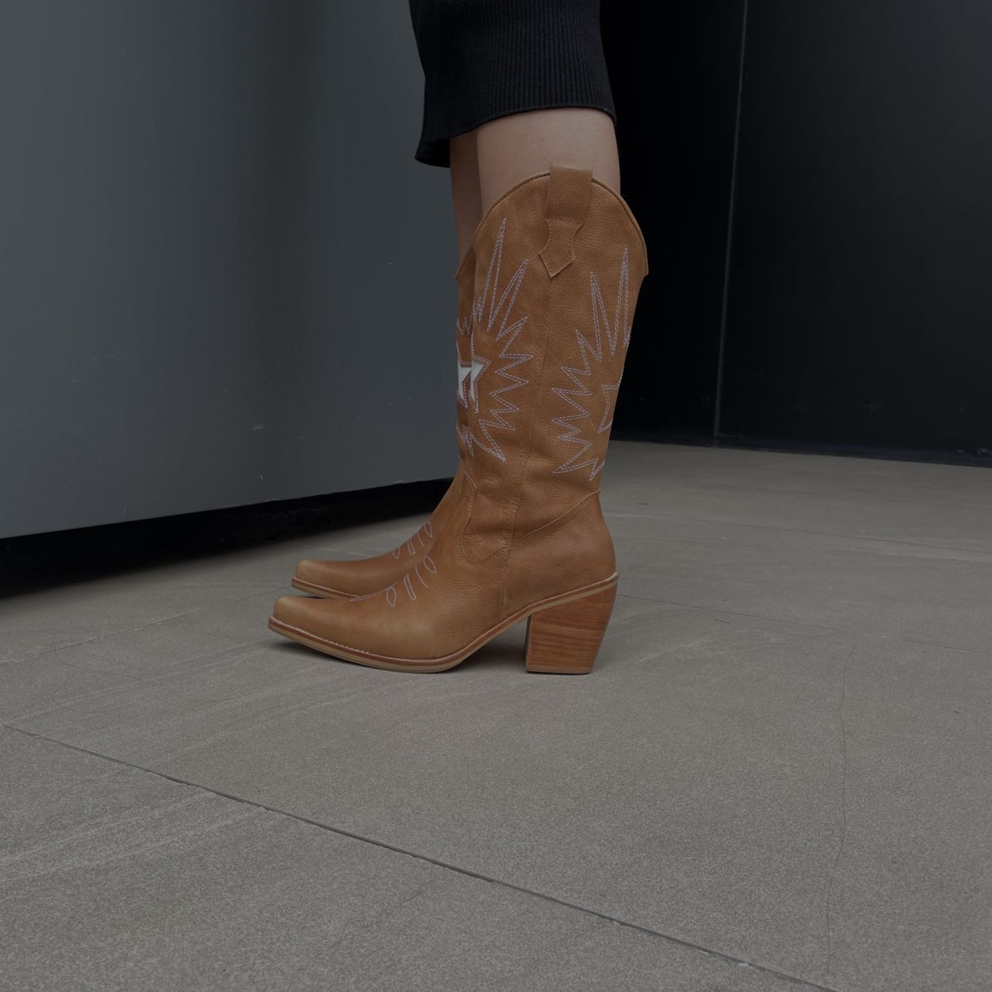 Bota texana de cuero color camel con detalles en blanco, 38 cm de largo , taco 8 cm, cierre. bota atemporal, para usar todo el año. 100% cuero por dentro y por fuera.