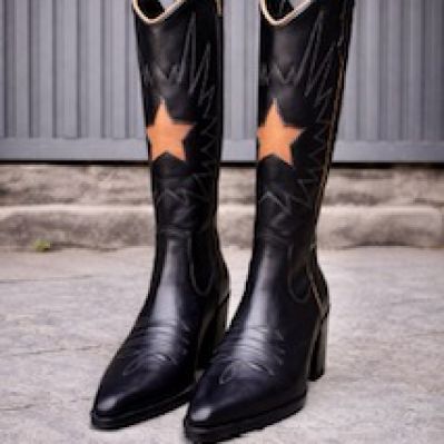 Botas largo clasico (una mano bajo la rodilla) estilo western en cuero color negro, con un diseño llamativo que incorpora una estrella en tono camel, aportando un toque original y único con detalles bordados que refuerzan su estética cowboy moderna. La caña alta estiliza la pierna, mientras que el tacón medio (7cm) proporciona comodidad y estabilidad para uso diario. Perfectas para darle personalidad a cualquier look, desde casual hasta más arreglado.