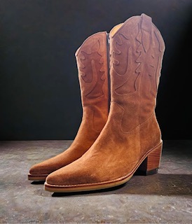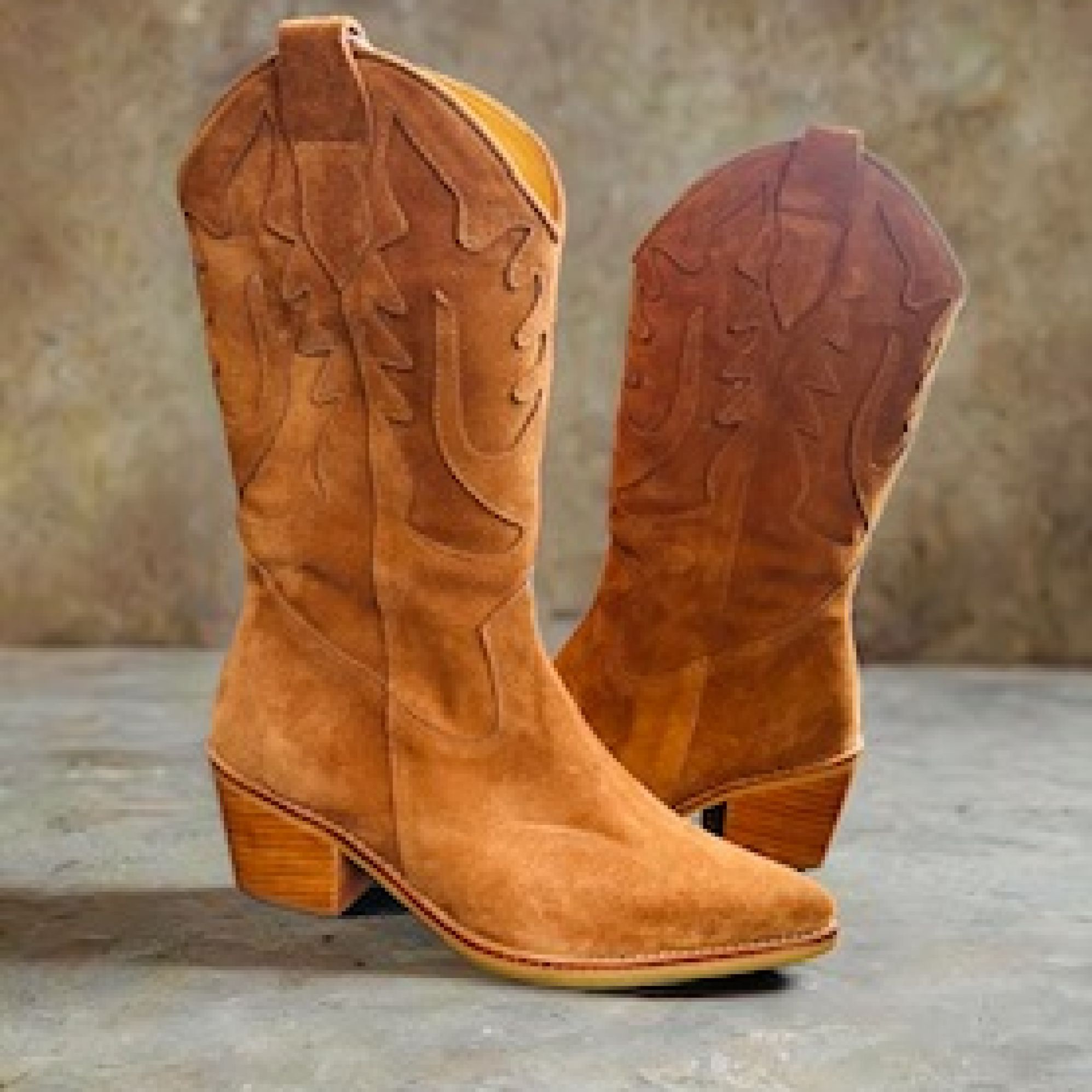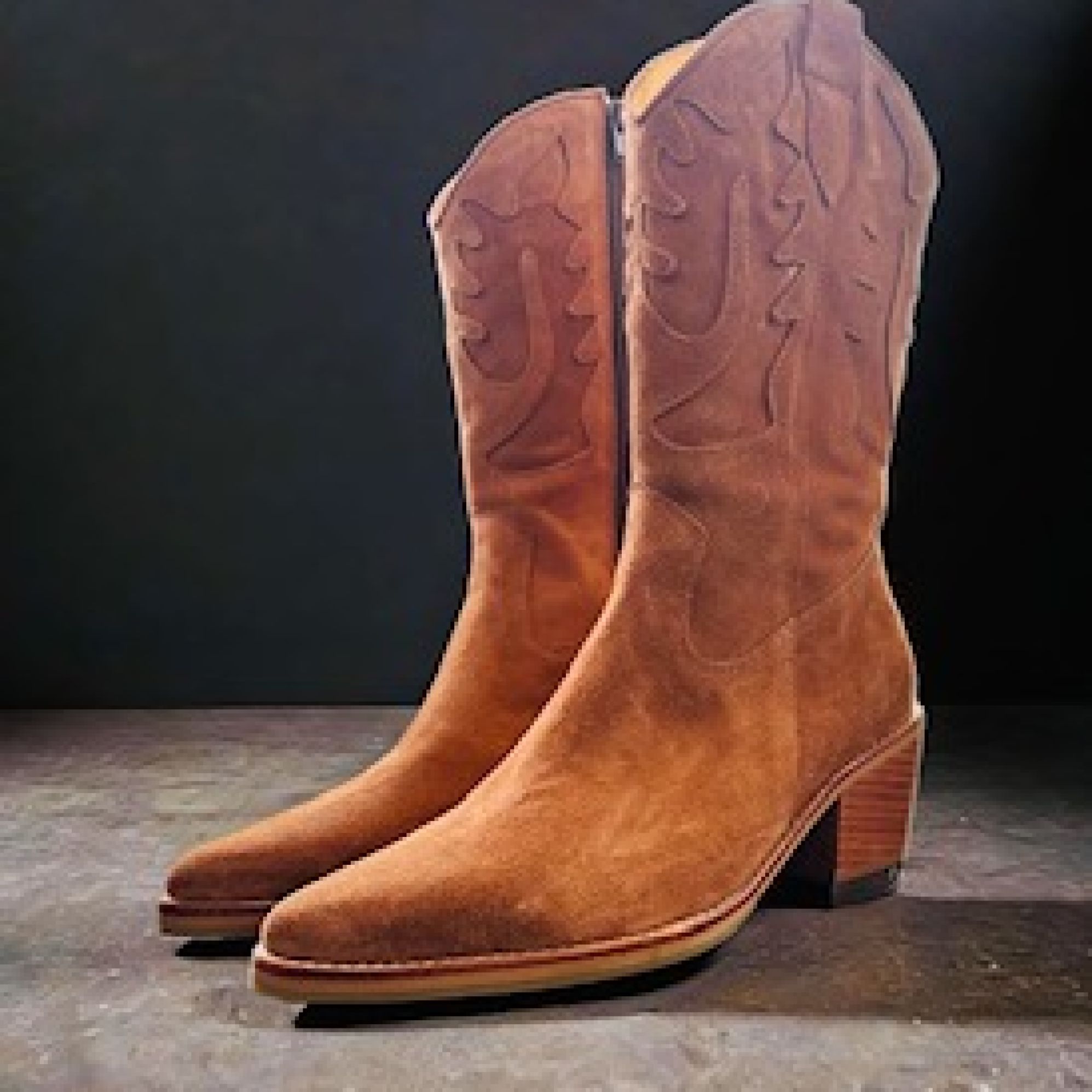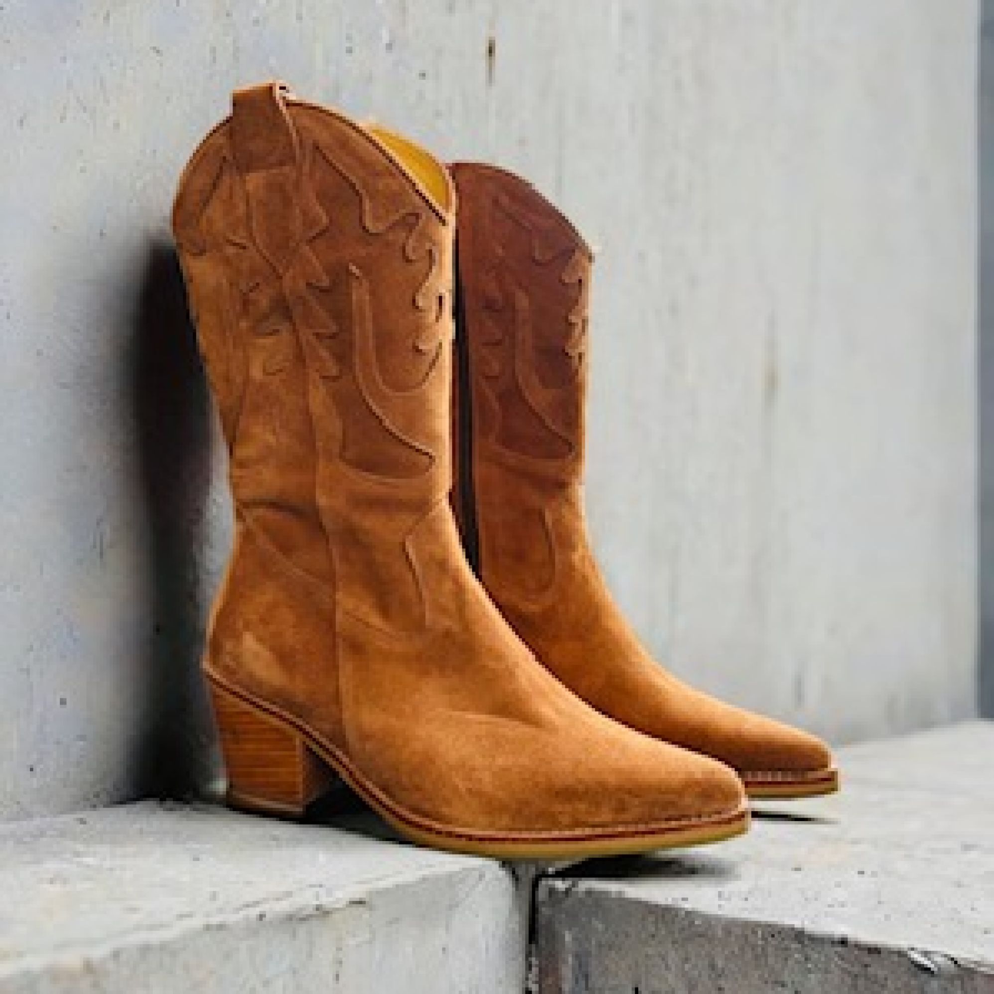 Bota Midi corte texano , 100% cuero reno , color caramelo, con un diseño de aplicaciones al tono muy chic. Taco 5 cm