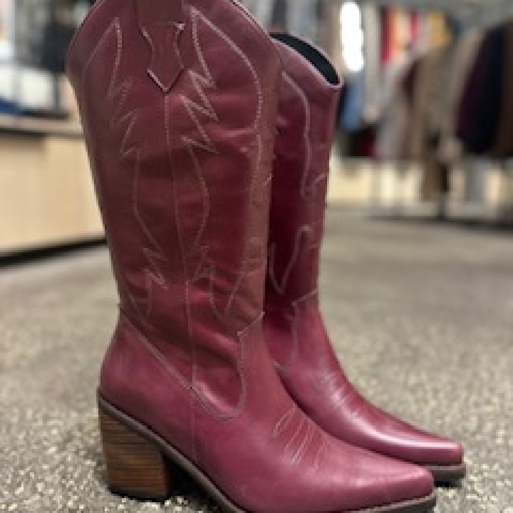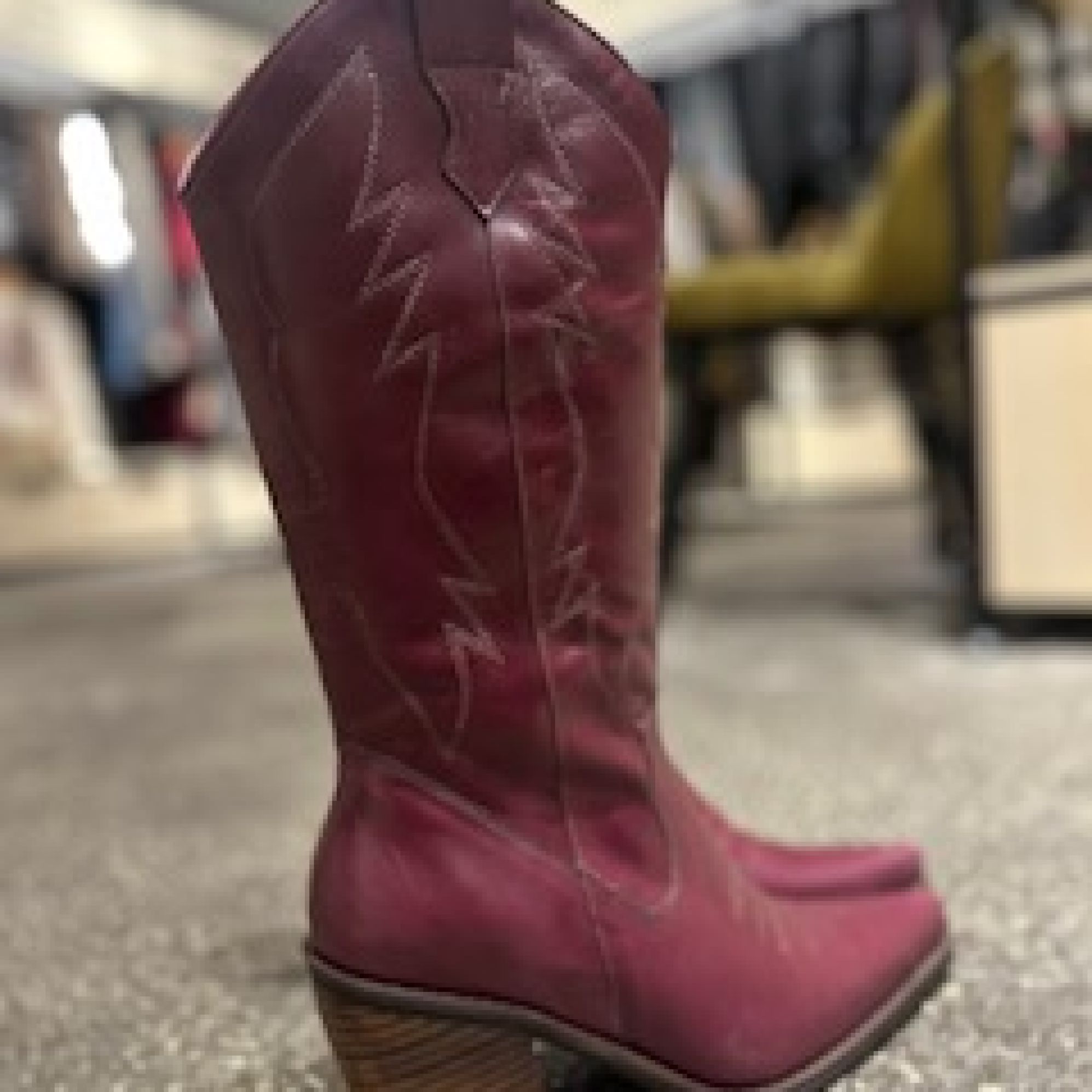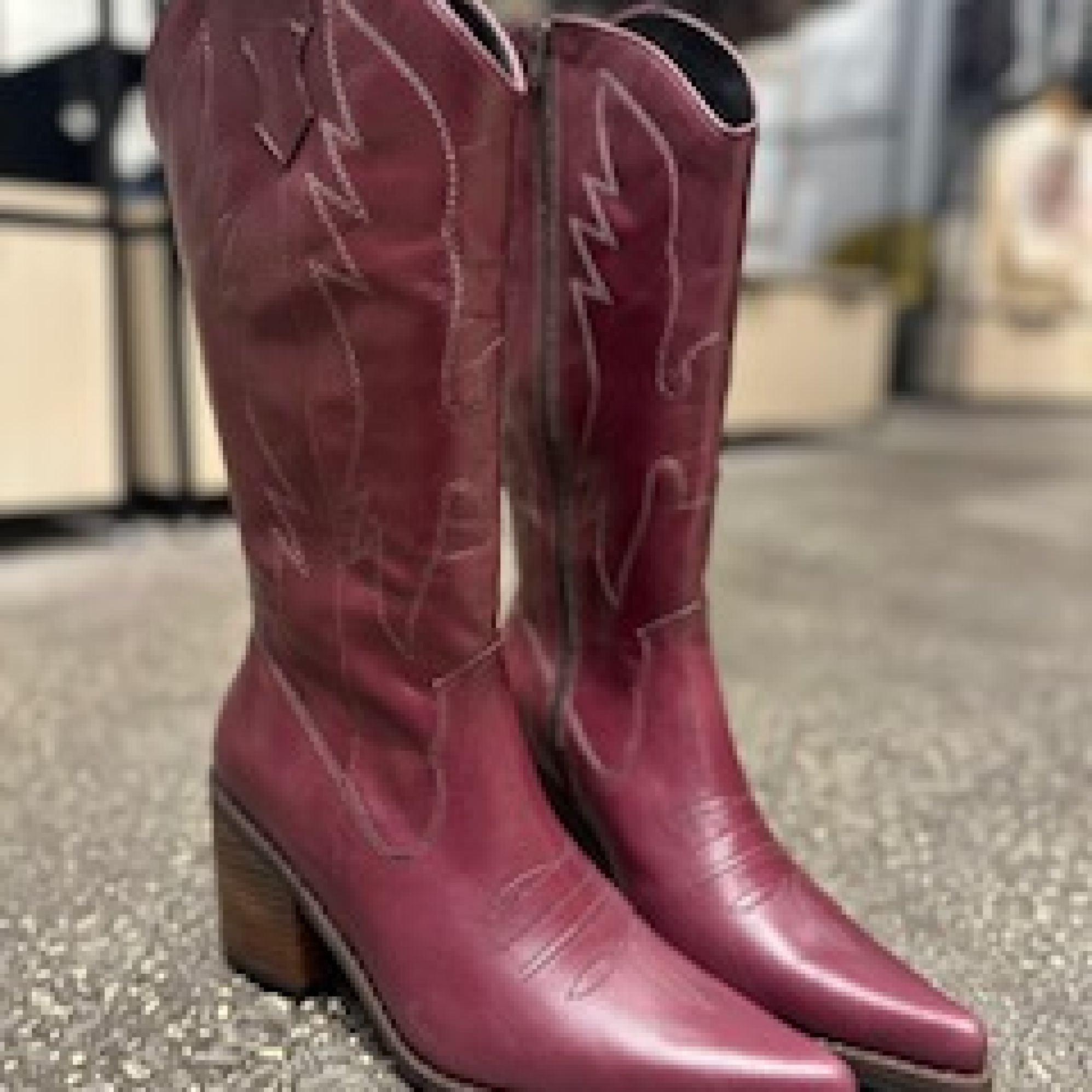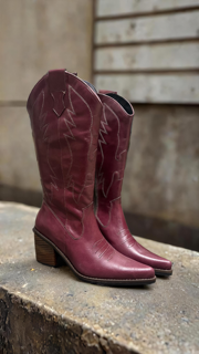 Bota Lusitana color burdeo con bordados, al tono. Sin lugar a dudas un espectáculo de bota. 100% cuero, taco 7 cm