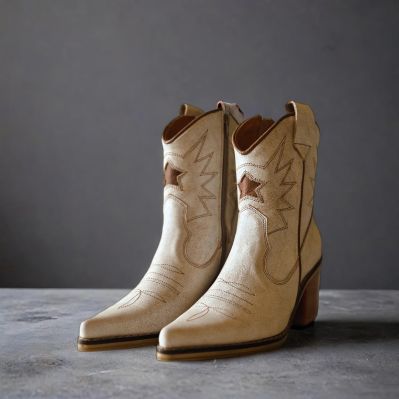 Botín Lusitano color Blanco invierno, con trabajo de desgaste a mano, lo que lo hace muy sobrio, elgante y unico. un botín estilizador por su corte vaquero, detalles y aplicaciones en color camela, bordados y aplicacion al tono
