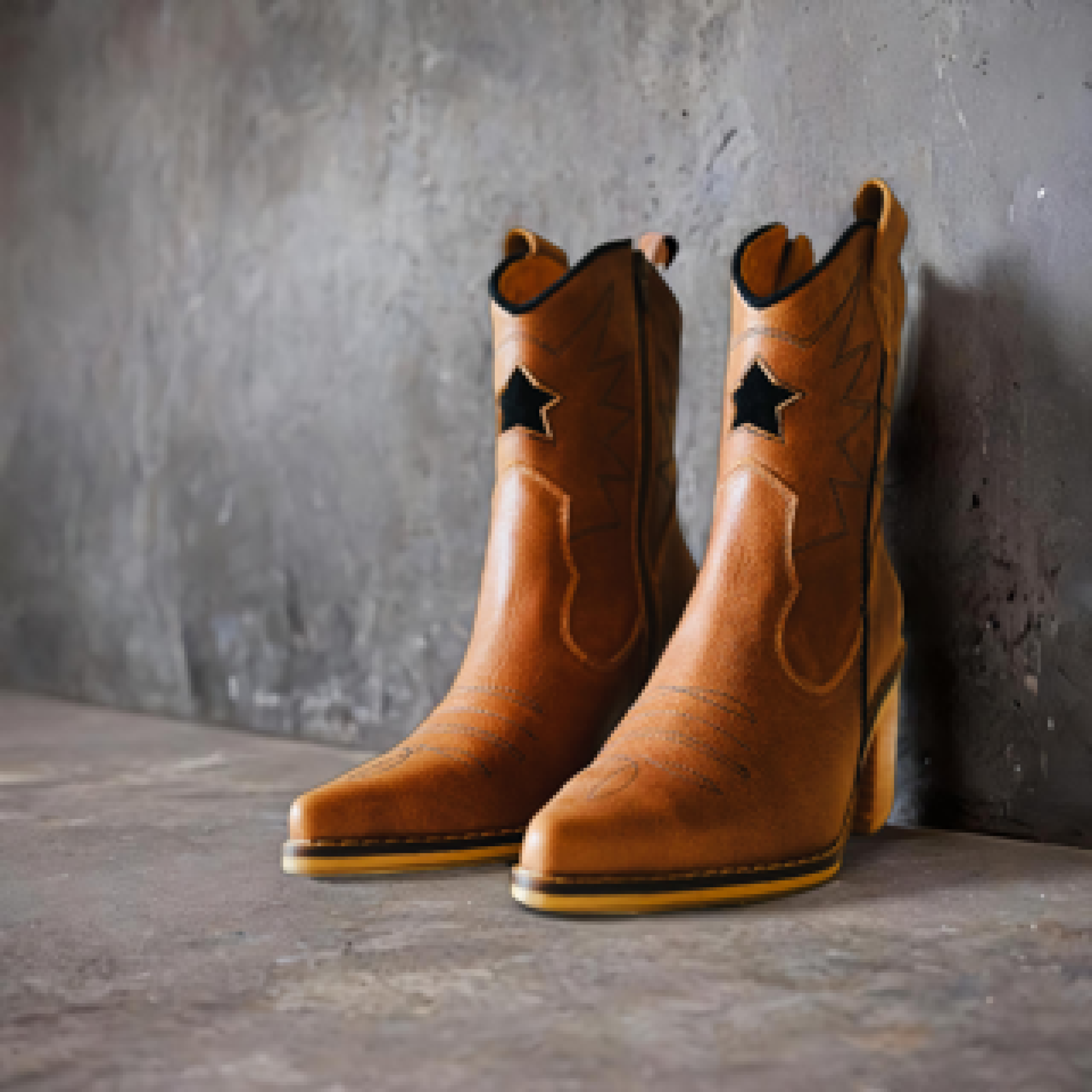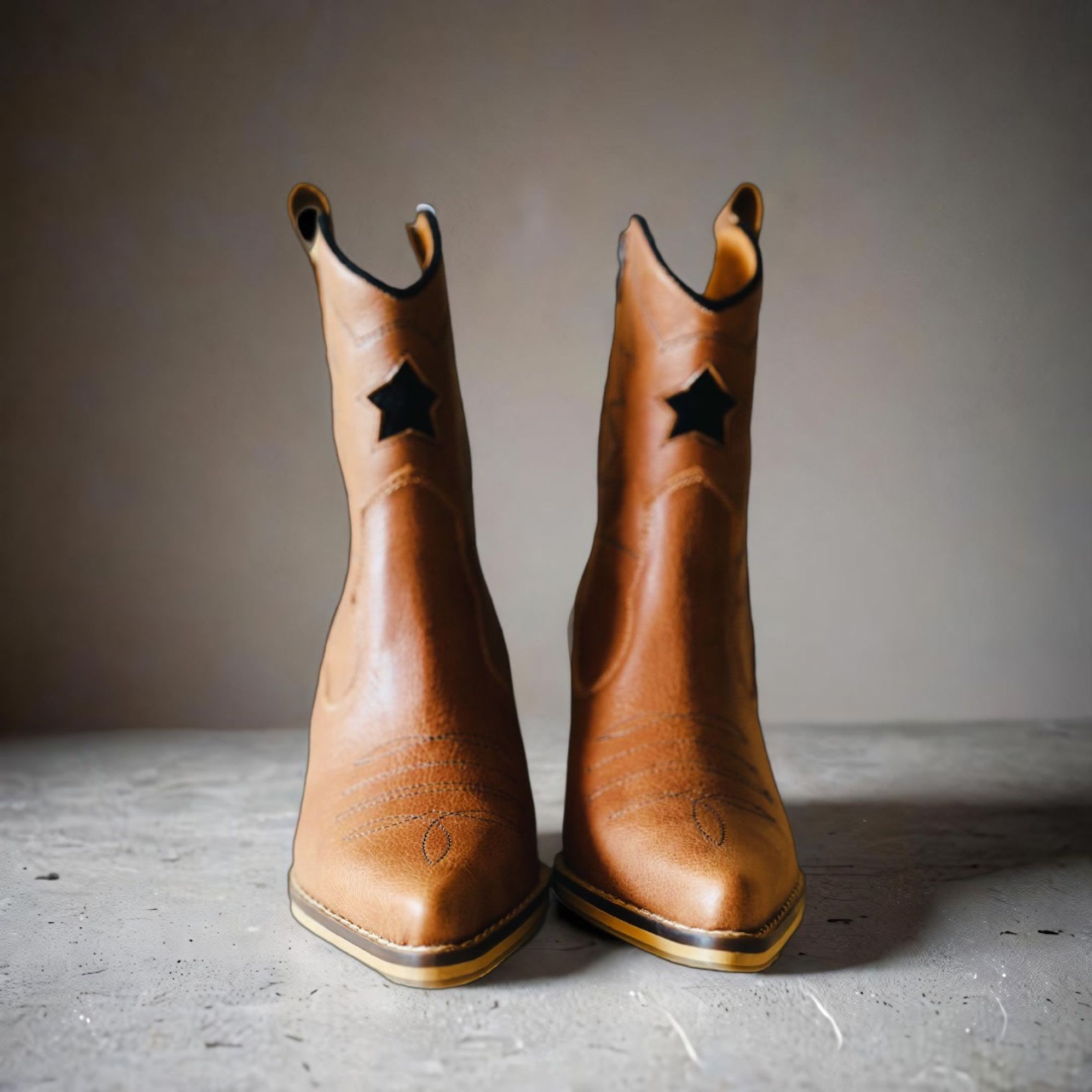 Botin Lusitano color camel, un botín muy elegante y estilizado por su corte vaquero, detalles y aplicaciones en negro, bordados y estrella al tono