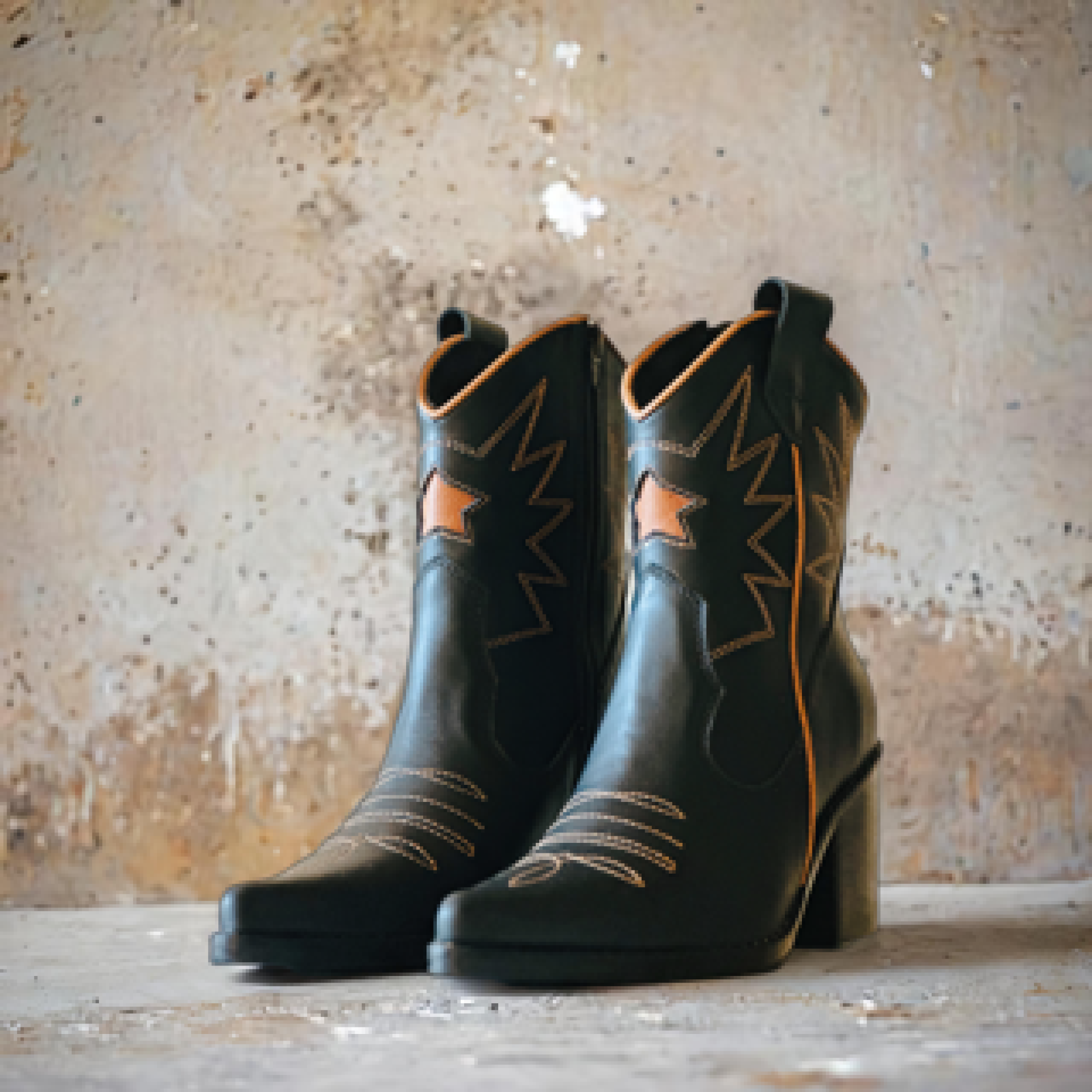 Botín Lusitano negro, un botín muy elegante y estilizado por su corte vaquero, detalles y aplicaciones camel, bordados y estrella al tono