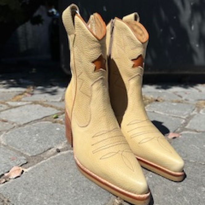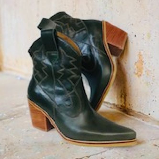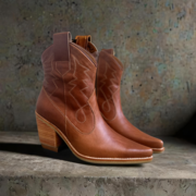 Botin Lusitano color Palo Rosa, con trabajo de desgaste a mano, lo que lo hace muy sobrio, elgante y unico. un botín estilizador por su corte vaquero, detalles y aplicaciones en color camel, bordados y aplicacion al tono